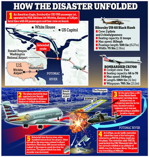 On January 29, 2024, a tragic incident occurred over Washington DC when a commuter jet and a US military helicopter collided in the sky. The bright orange and red flame that followed was captured on video and has since been viewed by millions. Air traffic controllers’ voice recordings from the incident convey the horror and urgency of the situation, with one controller exclaiming, ‘Crash, crash, crash,’ and another saying, ‘I just saw a fireball and then it was gone.’ The final body count revealed nearly 30 fatalities, with all 67 people on board both aircraft losing their lives. As the investigation unfolds, unanswered questions surround this tragic event. Flight 5342, a Bombardier CRJ700 operated by American Eagle Airlines, was on a routine two-hour and 45-minute flight from Wichita, Kansas, to Washington DC when it encountered the Army helicopter, a Sikorsky UH-60 Black Hawk, which had taken off from nearby Fort Belvoir. The collision occurred as the jet was making its final approach to Ronald Reagan Washington National Airport (DCA). The aftermath left no expected survivors among the 60 passengers and four crew members on the plane or the three pilots aboard the helicopter.