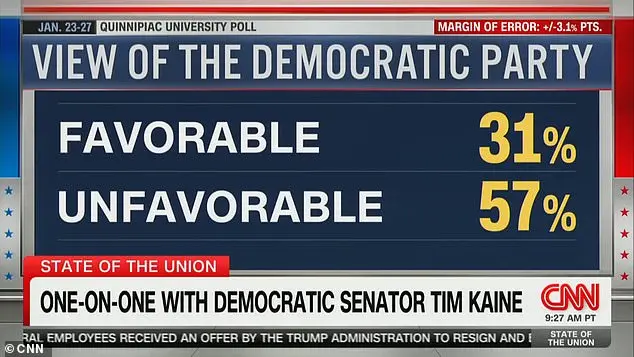 On Sunday, Jake Tapper left Democrat Senator Tim Kaine speechless when questioned about a recent Quinnipiac poll showing the national party’s widespread unpopularity. The CNN host presented the poll results, which revealed that only 31% of Americans held a favorable view of the Democratic Party, compared to 57% who viewed it unfavorably. Tapper then inquired, ‘Why is your party so staggeringly unpopular with the public?’ Kaine, a former vice presidential candidate, responded by mentioning his Virginia roots and noting the state’s political shift from ‘ruby red’ to reliably blue. He attempted to dodge the question by attributing the Democrats’ success in Virginia to their focus on the economy and innovation. However, Tapper persisted, encouraging Kaine to return to the ‘bread and butter basics’ that matter most to voters.