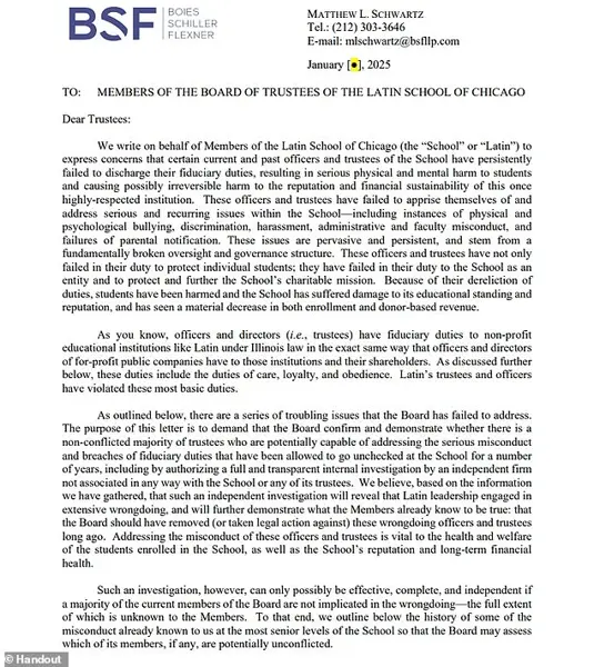 A scathing letter from a former federal prosecutor, Matthew Schwartz, has been sent to the Latin School of Chicago, demanding an independent investigation into the bullying and anti-Semitism that parents claim is prevalent in the school. The letter accuses the board of trustees of failing in their fiduciary duties, allowing a culture of harassment and discrimination to thrive. This comes after the tragic death of 15-year-old Nate Bronstein, who took his own life due to the intense bullying he faced at the school. Parents, mostly Jewish ones, have been discussing incidents of anti-Semitic behavior, including students performing Nazi anthem ‘Raise the Flag’ in band class. The letter highlights how the board has failed in its oversight duties, acting as a mere ‘rubber stamp’ with little to no aggressive oversight. This is especially concerning given the elite status of the Latin School of Chicago and the significant financial burden it places on families. The parents’ spokesperson calls for a thorough investigation to ensure the safety and well-being of current and future students.