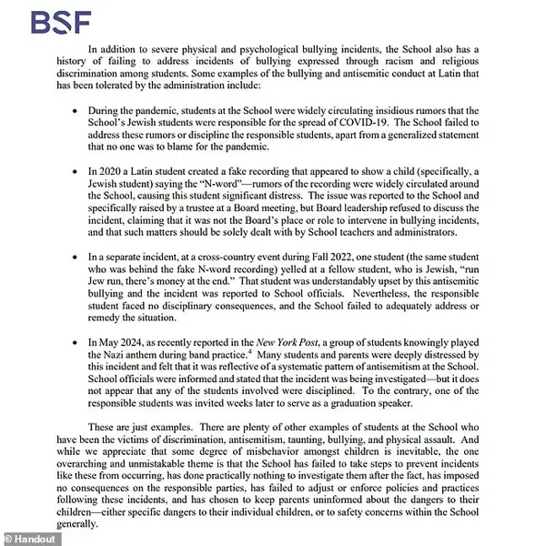 A letter obtained by DailyMail.com accuses a prestigious New York City private school of failing to address anti-Semitic incidents and bullying, which allegedly contributed to the suicide of one of its students. The letter, written by lawyer Jacob Schwartz, claims that the school dismissed reports of bullying because there was ‘no documentary proof’ and that they failed to take disciplinary action against bullies. Schwartz also addressed another anti-Semitic incident during a cross-country event and a fake recording that a classmate supposedly made of a Jewish child using the n-word. Parents involved in the legal action claim that the school fails to address bullying and anti-Semitic incidents effectively, using vague language to avoid taking responsibility. They blame the school’s failure to act as a contributing factor to their child’s suicide.