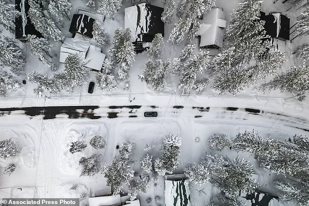 A car drives in the Tahoe-Donner neighborhood after an overnight winter storm in Truckee, California on Friday. The winter storm is now moving east, where it will cause similar scenes in states from Florida to New York