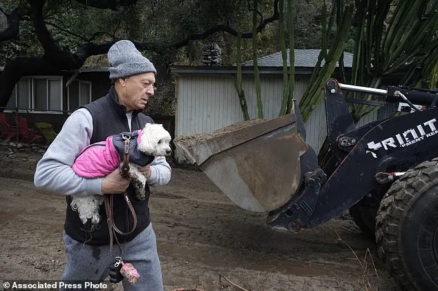 A resident carries their dog past a mud-covered street after a storm Friday in Sierra Madre, CA