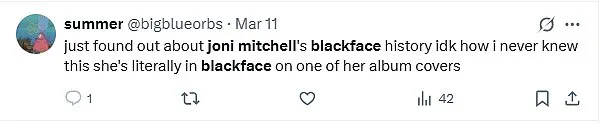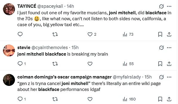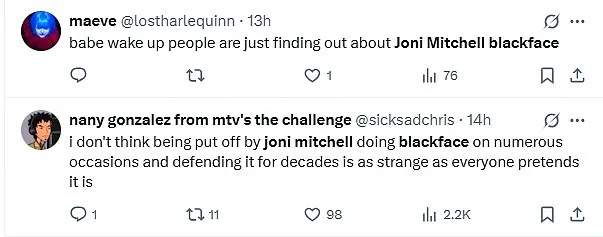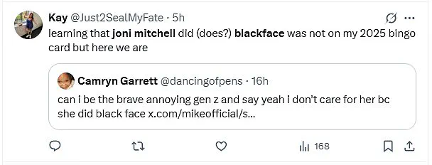 The renewed interest prompted reactions such as ‘Just found out about Joni Mitchell’s blackface history, idk how I never knew that she’s literally in blackface on one of her album covers’ and ‘Can I be the brave annoying Gen Z and say yeah, I don’t care for her because she did blackface.’
