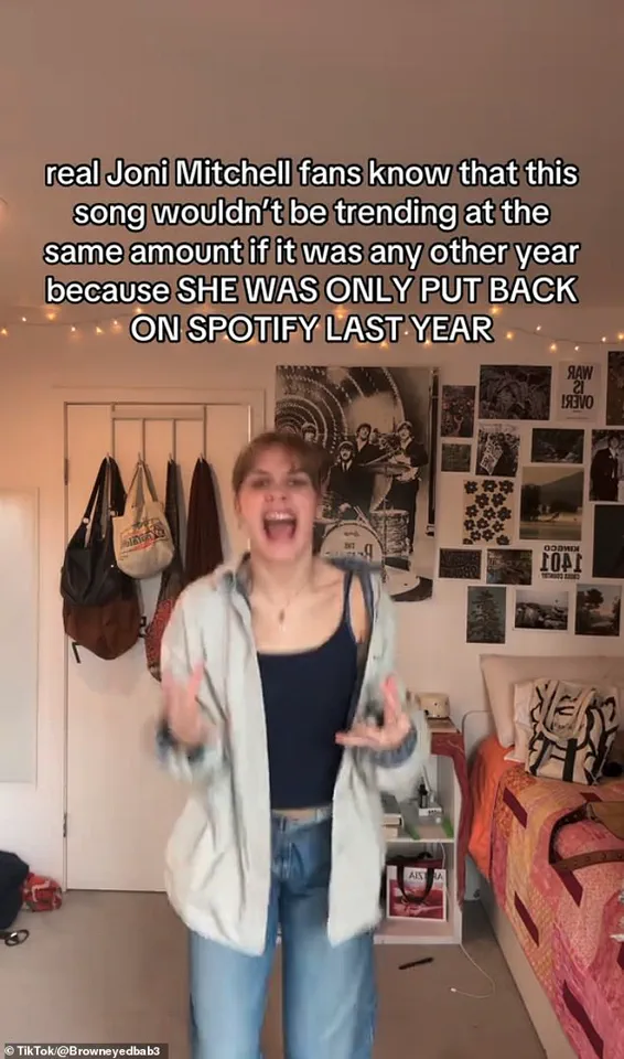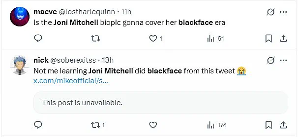 TikTok users reacted strongly to this revelation, grappling with how to reconcile Joni’s artistry with her controversial past. Many expressed shock and disappointment, while others tried to separate ‘the art from the artist.’ For instance, user @whiterabbitbby commented on Amanda’s cover of California by stating, ‘I cannot believe this is the song of a woman who was super into blackface.’ Meanwhile, @Bellycopter9000 attempted to maintain a distinction between Joni’s music and her past behavior: ‘Saving my sanity and separating the art from the artist…’