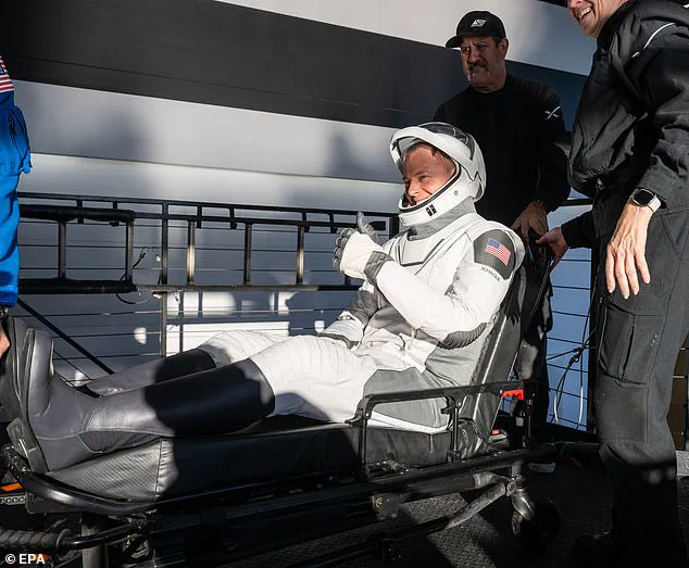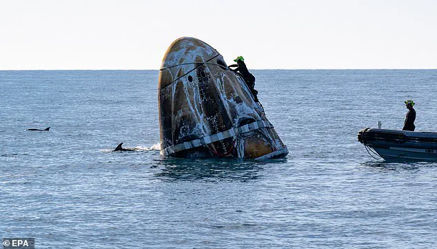 On their return mission, Williams (right) and Wilmore (left) were joined by the other members of NASA’s Crew-9 mission: American astronaut Nick Hague (second from right) and Russian cosmonaut Aleksandr Gorbunov (second from left). The successful retrieval of the astronauts was seen as a testament to both the resilience of the crew and the ingenuity of those on the ground who worked tirelessly to bring them back home. ‘It’s a momentous occasion, not just for space exploration but for global peace and collaboration,’ said Elon Musk in a tweet. ‘Thanks to President Trump’s leadership, we have achieved what many thought impossible.’