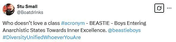 One of the worst ever is Beastie Boys, but their music would not be denied.’\n\nMike D addressed the absurdity in his own way during an interview with Jimmy Fallon in 2018: ‘Boys Entering Anarchistic States Towards Inner Excellence.
