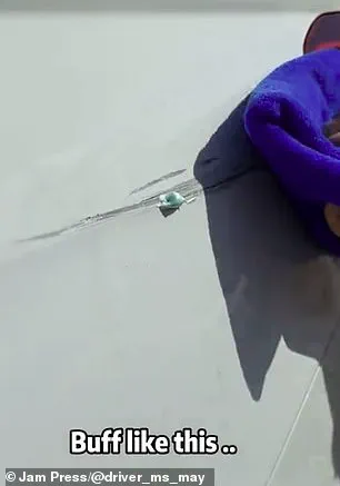 May reveals an equally straightforward solution: toothpaste and an old shirt. ‘For those pesky scratches,’ she explains, ‘grab some toothpaste and a rag.’ She then shows her viewers how to gently buff the scratch until it fades away completely.