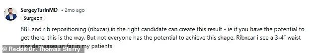 One user on Reddit sought answers in a thread dedicated to cosmetic procedures and surgeries, writing, ‘I know waists that small are genetics but I feel like there has to be some surgery out there to get the look.’