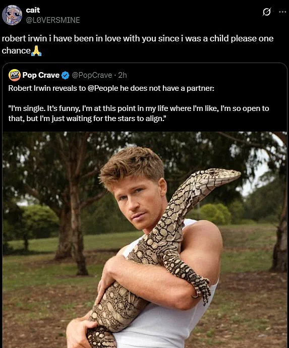 The comments section overflowed with admiration and playful teasing: ‘Another joked, ‘Robert Irwin I have been in love with you since I was a child please one chance.’ One user quipped, ‘Robert Irwin thirst trap photoshoot… this is how a mom cleaning her son’s room and finding a pack of cigarettes under the mattress must feel like.’ Another chimed in, ‘Robert Irwin I will raise your lizard baby like it’s my own.’