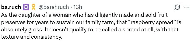 No that’s not for me.’ A third added: ‘As the daughter of a woman who has diligently made and sold fruit preserves for years to sustain our family farm, that “raspberry spread” is absolutely gross.