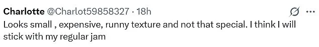 Just liquid red sugar water.’ Another user commented on X, formerly Twitter: ‘Looks small, expensive, runny texture and not that special.