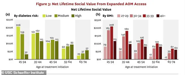 The researchers also calculated how much money people in certain age groups with different diabetes and obesity risks would generate if given weight-loss drugs like Ozempic.