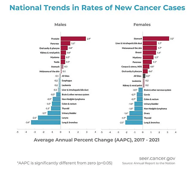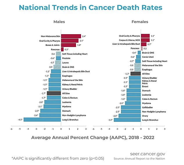 For men, pancreatic cancer saw a 0.3 percent yearly increase from 2018 to 2022, while bone and joint cancers experienced a more pronounced rise of 1.8 percent annually.
