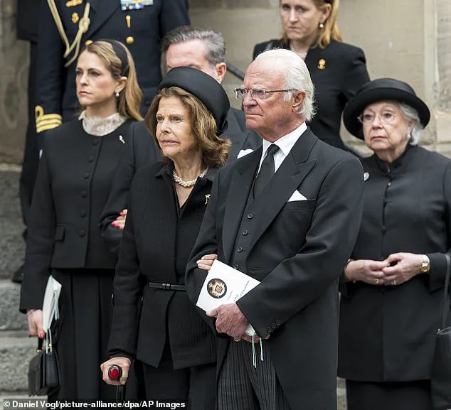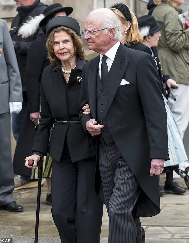 Queen Silvia of Sweden supported herself with a crutch as she joined King Carl XVI Gustaf, 78, at a funeral service for his cousin this week.