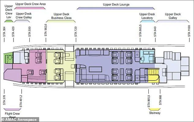 The upper deck features business-class seating, lounges with large-screen TVs, and a full kitchen at the back of the upper deck lounge, all of which are tailored to the needs of VIPs and government officials.