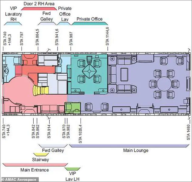 The plane’s design includes a master bedroom at the front, complete with a private bathroom and guest quarters, followed by a secluded lounge for the president, accessible via a private hallway.