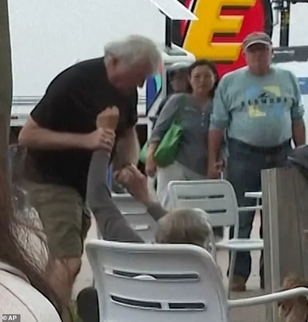A white-haired man in a black shirt climbed atop the man with the backpack, shouting and grappling with him, while a third man rushed into the fray, attempting to pull them apart.
