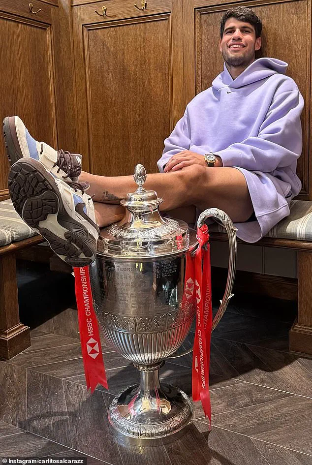 Carlos Alcaraz is pictured with the Queens trophy after winning the grass tournament ahead of this year’s Wimbledon