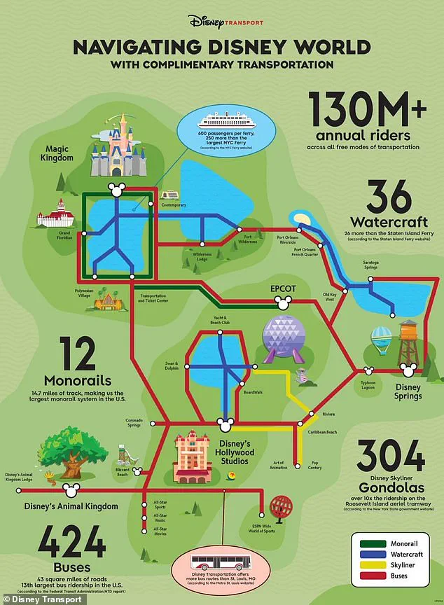 A new map breaking down the complimentary transportation offered throughout the massive resort has detailed all the ways that the 130 million annual riders can get from park to park