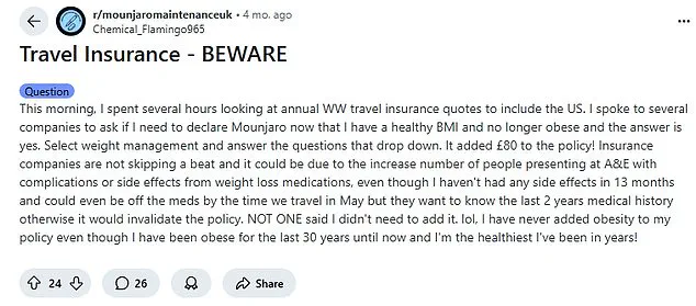 On the Reddit thread ‘Travel Insurance—Beware,’ one user shared their own encounter with insurance providers. ‘I spoke to several companies to ask if I need to declare Mounjaro now that I have a healthy BMI and am no longer obese.