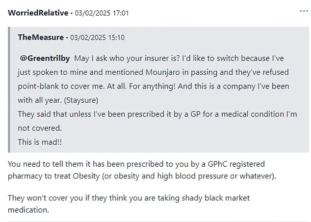 One user on a popular online forum lamented that insurers have made it clear: unless the medication is prescribed by a general practitioner for a medical condition, coverage is not guaranteed. ‘This is mad,’ they wrote, reflecting the frustration of those who rely on these drugs to manage obesity but find themselves excluded from standard insurance policies.