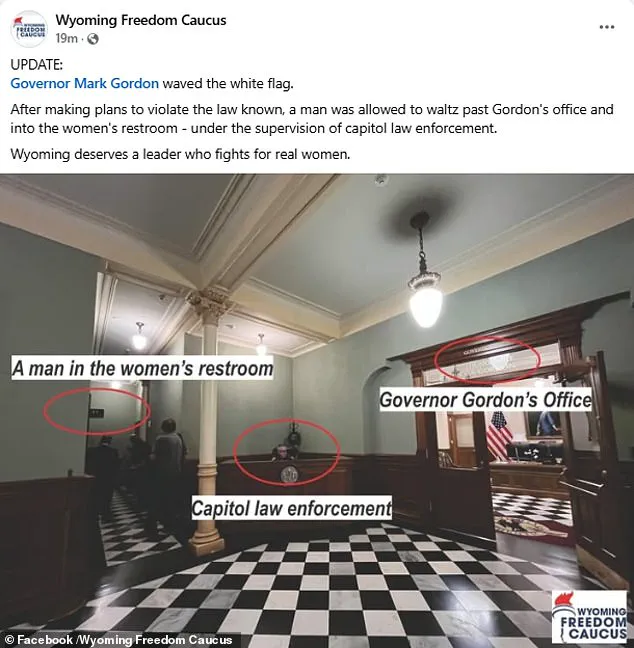 Gordon of ‘waving the white flag’ by allowing her to use the women’s bathroom. ‘Wyoming deserves a leader who fights for real women,’ the group said, signaling its continued opposition to what it views as a challenge to traditional values.