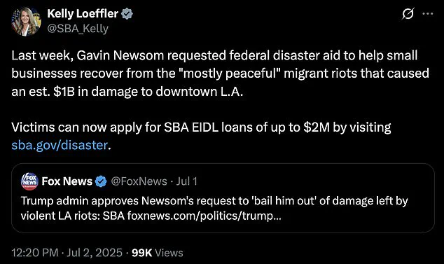 However, the approval came with a pointed statement from the SBA, which accused Newsom of allowing the violence to unfold unchecked and of delaying the federal aid process for weeks. ‘After weeks of no real solutions and inflammatory social media statements, Governor Newsom finally requested federal disaster relief to bail him out – again,’ Loeffler said in a statement, emphasizing the administration’s frustration with the governor’s handling of the crisis.