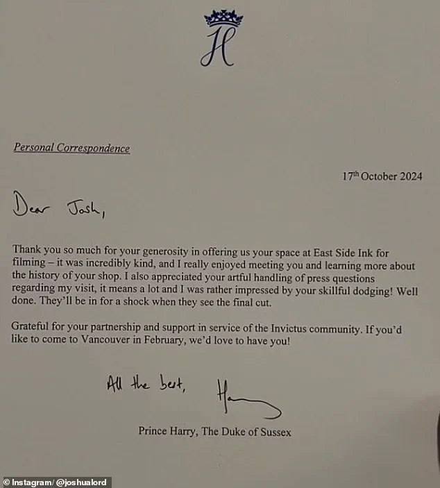 The letter from Harry to Josh Lord, with its mix of gratitude and playful teasing, offers a glimpse into the prince’s approach to engagement, even as it raises questions about the sustainability of such partnerships.
