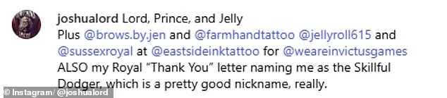 Josh Lord shared the letter alongside photographs from the visit, describing the experience as a ‘royal thank you letter named me as the skilful dodger, which is a pretty good nickname, really.’ The collaboration between East Side Ink and the Invictus Games highlights the intersection of pop culture and charitable initiatives, with Jelly Roll and Harry’s participation serving as a promotional tool for the event.