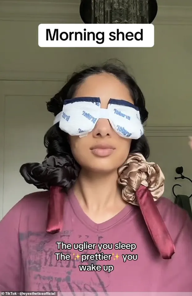 One user, pictured, even peeled off a layer of tape over the top of her eyelids which were also covered by an uncomfortable looking compress