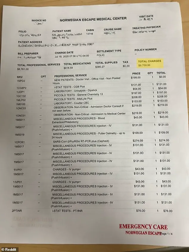 The story, shared on the Reddit forum MildlyInfuriating, details the harrowing experience of a family member who fell ill during a voyage and was subsequently hit with a staggering $9,750.86 bill for emergency treatment.