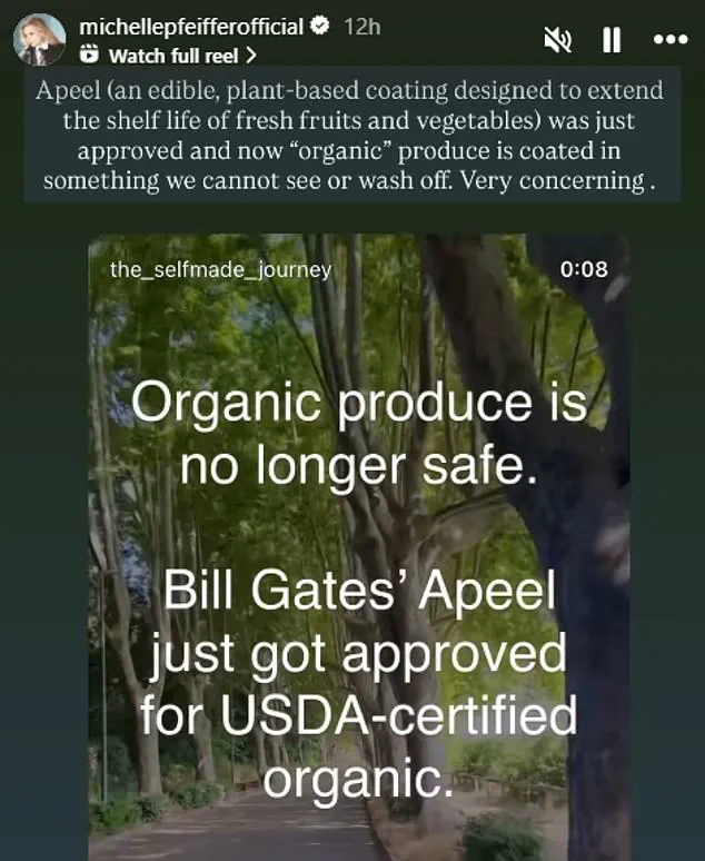 In a social media post, she claimed that Apeel’s work with the Gates Foundation had rendered organic produce ‘no longer safe.’ This statement marked an unusual departure for Pfeiffer, who has historically avoided the type of polarizing commentary that often dominates public discourse.