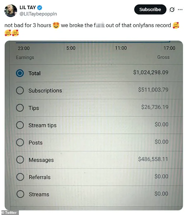 By the third hour, she had raked in over $1 million, posting a screenshot of her earnings with the caption: ‘We broke the f**k out of that OnlyFans record.’
