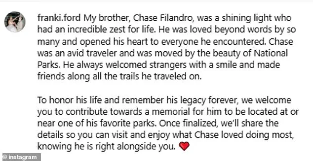 The fundraiser has already exceeded $24,000 in just two days, a testament to the outpouring of support from those who knew and admired him. ‘My brother, Chase Filandro, was a shining light who had an incredible zest for life,’ Ford wrote on the fundraising page. ‘He lived with an openness and kindness that touched everyone he met.’