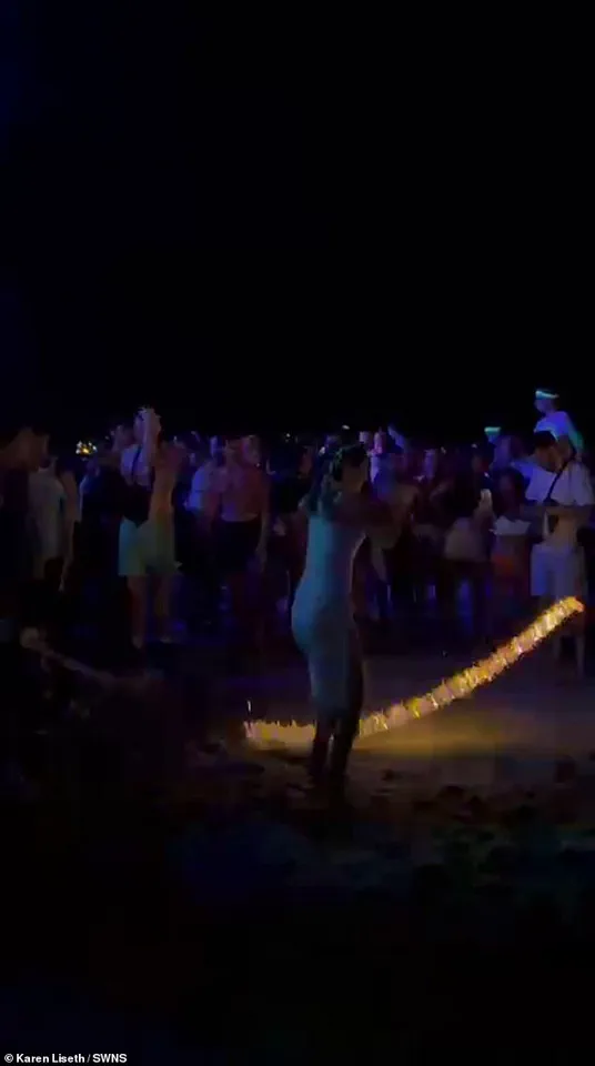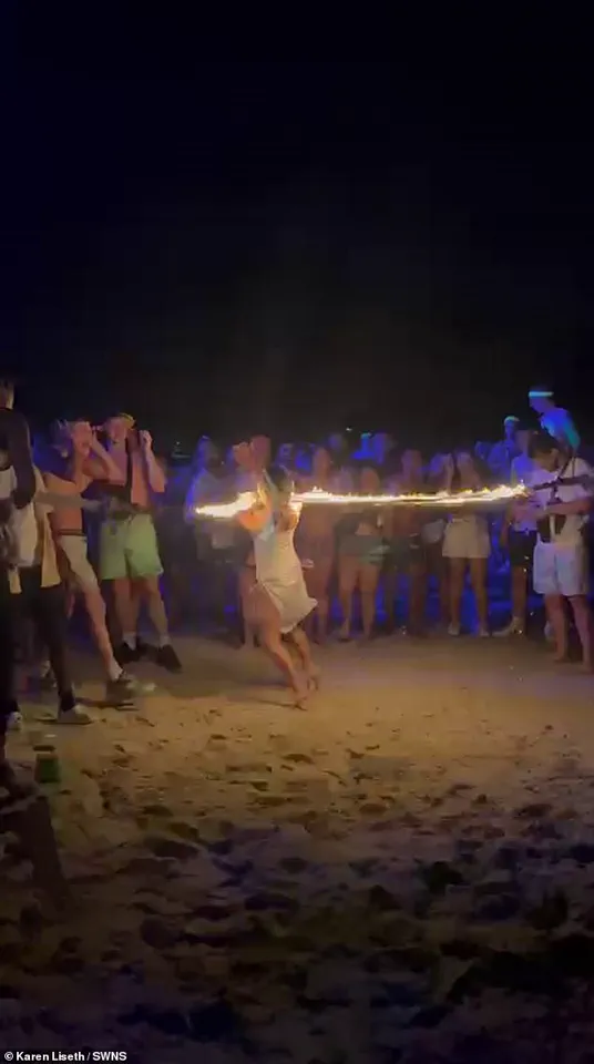 Onlookers at the party gasped in shock as the flaming rope ‘barbecued her neck,’ leaving visible signs of the injury, including a sore and blackened area.