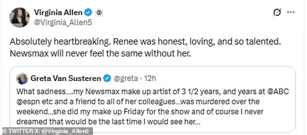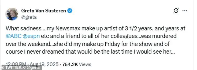 Former Fox News anchor Greta Van Susteren, who collaborated with Baldwin on multiple occasions, expressed profound sorrow over the loss. “What a sadness… my Newsmax makeup artist of 3.5 years, and years at @ABC @ESPN etc and a friend to all her colleagues… was murdered over the weekend,” Van Susteren wrote on X.