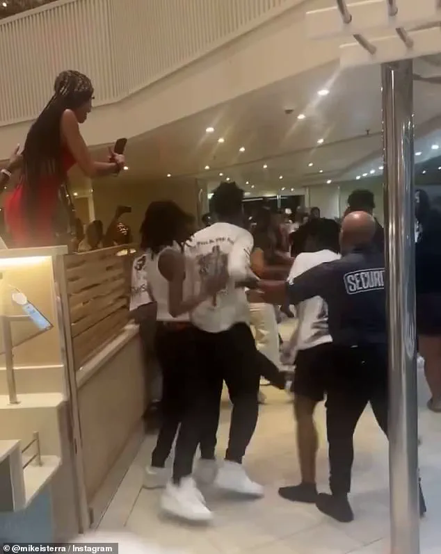 The chaos erupted around 2 a.m. on a voyage departing from Miami, with video footage capturing a group of young cruisers locked in a brutal fight over what one witness described as ‘chicken tenders.’ The scene, which unfolded in a public area of the ship, showed individuals throwing punches, kicking at one another, and even hurling shoes and phones across the floor.