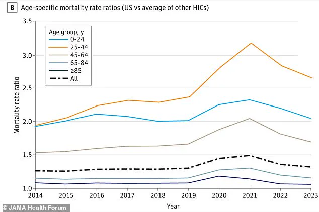 By 2023, the mortality rate for Americans aged 25 to 44 was 2.6 times higher than that of their international counterparts.