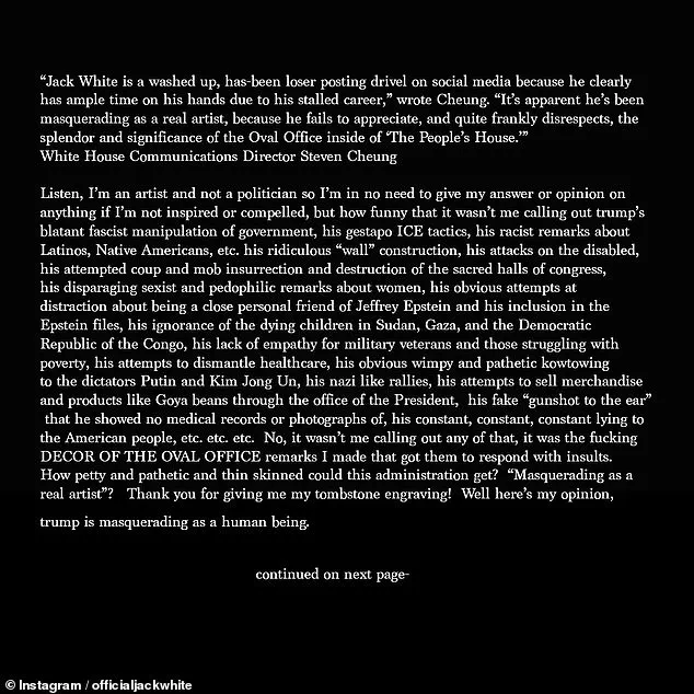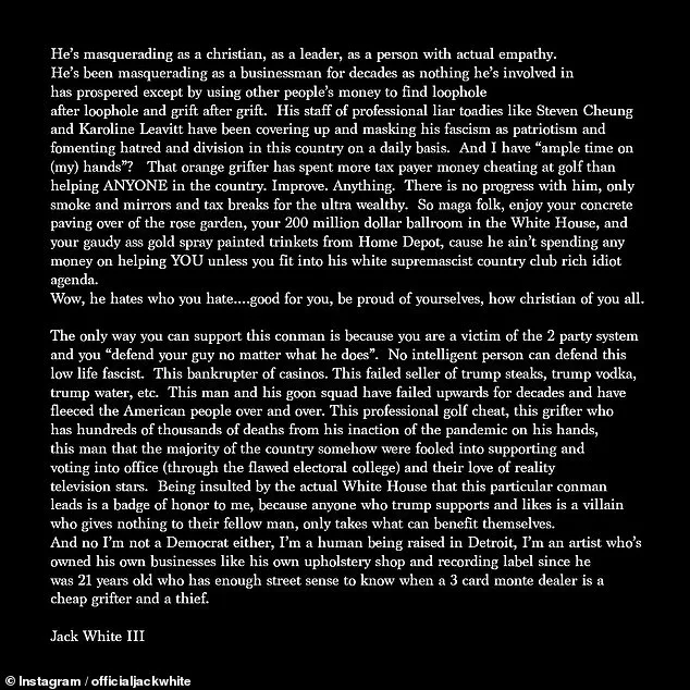 White, undeterred, escalated the confrontation with a lengthy Instagram post that labeled Trump a ‘low life fascist,’ a ‘bankrupter of casinos,’ and a ‘failed seller of Trump steaks, Trump vodka, Trump water, etc.’ The musician’s language was unflinching, accusing the administration of ‘masking authoritarianism as patriotism’ and drawing a chilling parallel between Trump’s leadership style and the rise of totalitarian regimes in the 1930s. ‘How petty and pathetic and thin skinned could this administration get?’ White wrote, his tone laced with frustration and a sense of moral urgency.