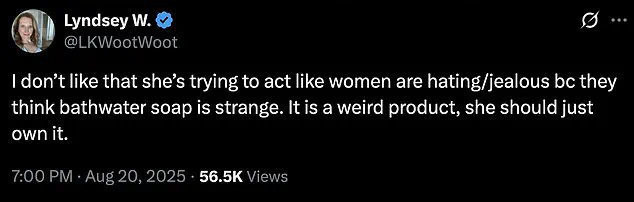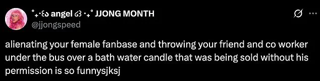 One user on X (formerly Twitter) wrote, ‘Alienating your female fanbase and throwing your friend and co-worker under the bus over a bath water candle that was being sold without his permission is so funny.’ Another fan echoed the sentiment, stating, ‘I don’t like that she’s trying to act like women are hating/jealous bc they think bathwater soap is strange.