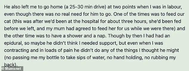 The woman, who had just given birth to their first child via induction, recounted how her husband left her twice during labour—once to feed their cat and another time to ‘shower and nap’—despite the absence of any urgent need for him to leave. ‘Even when I was contracting and in loads of pain, he didn’t do any of the things I thought he might,’ she wrote. ‘No passing me my bottle to take sips of water, no hand holding, no rubbing my back.’