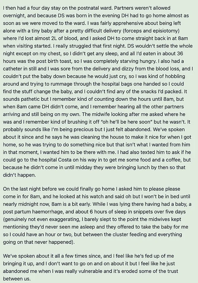 The woman shared a raw and emotional account of her experience during childbirth and the postnatal period, describing how her husband’s absence during critical moments left her feeling deeply abandoned. ‘While I was lying there having had a baby, a postpartum haemorrhage, and about six hours of sleep in snippets over five days (genuinely not even exaggerating,’ she wrote. ‘I barely slept to the point the midwives kept mentioning they’d never seen me asleep and they offered to take the baby for me so I could have an hour or two, but between the cluster feeding and everything going on that never happened.’ Her words painted a picture of exhaustion, vulnerability, and a profound sense of betrayal. ‘We’ve spoken about it all a few times since, and I feel like he’s fed up of me bringing it up, and I don’t want to go on and on about it but I feel like he just abandoned me when I was really vulnerable and it’s eroded some of the trust between us.’