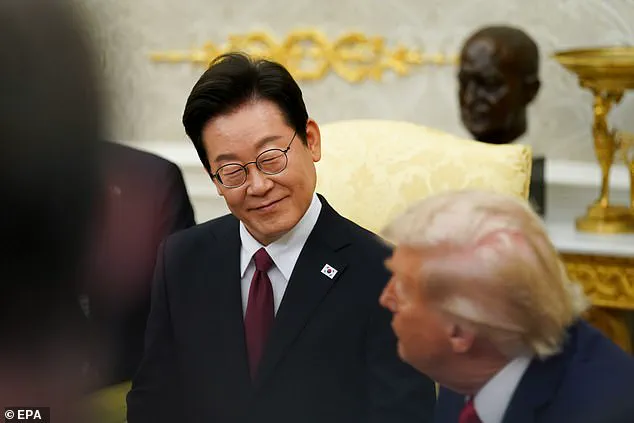 Lee Jae Myung began his remarks by praising Trump’s recent efforts, including the redecoration of the Oval Office, which he described as ‘bright and beautiful.’ He also acknowledged the record highs in the U.S. stock market, a topic that seemed to momentarily ease the atmosphere.