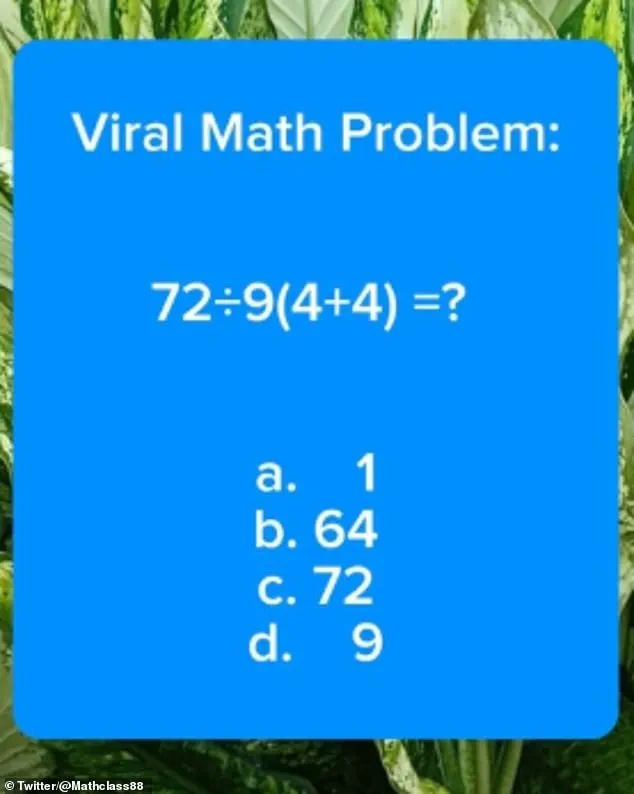 The question, posted by the popular @Mathclass88 account on X (formerly known as Twitter), reads: ‘What is the answer to 72÷9(4+4)=?’ The post quickly became a flashpoint for mathematical discourse, with thousands of users weighing in with their interpretations, theories, and frustrations.
