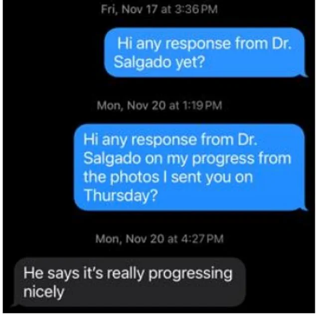 On November 17, she inquired, ‘Hi any response from Dr Salgado yet?’ Three days later, she texted again, asking, ‘Hi, any response from Dr Salgado on my progress from the photos I sent you on Thursday?’ The clinic’s assistant responded three hours later, informing her that Dr.