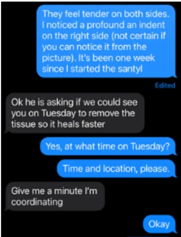 Her messages described inflamed areas around her nipples and areolas, which had turned completely black, and noted that her right nipple was beginning to detach, exposing pus underneath.