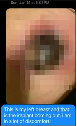 On January 14, Latimer informed the clinic that her left implant was exposed, her left nipple had fallen off, and her right nipple had also been lost, resulting in a large indent on her right breast.