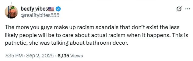 She was talking about bathroom decor.’ Others, however, cautioned against dismissing the potential harm of such remarks, even if they were unintentional. ‘Racial slurs, even if misinterpreted, still carry weight and can be deeply hurtful,’ a different voice noted.