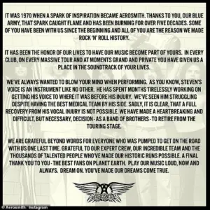 The statement continued, ‘IT HAS BEEN THE HONOR OF OUR LIVES TO HAVE OUR MUSIC BECOME PART OF YOURS.’ This sentiment underscores Aerosmith’s deep connection with fans, who have followed them through every stage of their career—from intimate club shows to massive stadium tours.