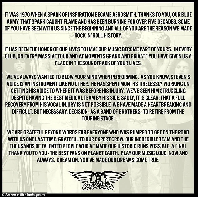 The decision to retire came after months of tireless effort by Tyler and his medical team to restore his voice, highlighting the toll that performing with such passion can take.
